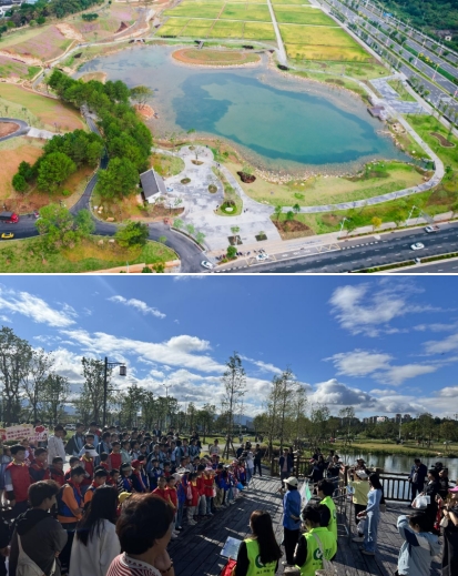 龍州濕地是九龍江流域山水林田湖草沙一體化保護和修復項目海綿城市建設范例工程,也是我市2023年十大重點攻堅項目北部新城建設的“點睛之筆”,主要使用的是國家政策補助資金。項目占地面積約20公頃,通過“護山、理水、營林、興田、清湖、豐草”六大舉措,構建了蓄洪湖區、生態修復區、農田區及休閑區多樣用地,同時設置了蓄洪湖、濕地步道、山谷攔蓄、引水工程等海綿設施,實現“城在田中田在城中”山水田園與城市和諧共生的美好景象。