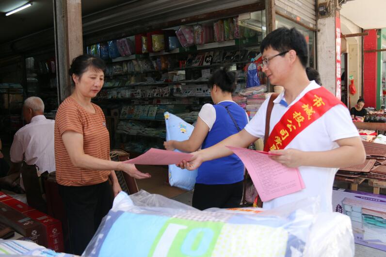 志愿者向居民和商業店鋪發放宣傳資料《創建全國文明城市倡議書》《創建全國文明城市應知應會知識》《創建全國文明城市知識問卷》,向居民和商業店鋪講解了“創城”的意義,并與執法大隊人員一起對沿街不規范的店鋪進行整改。