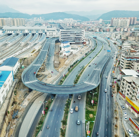 該項目屬于火車站北片區(qū)“一橫一縱一環(huán)”路網(wǎng)中的一環(huán),是火車站北站房片區(qū)的重點工程,也是連接羅龍路與火車站北站房旅客出發(fā)平臺的唯一通道,項目建成對完善片區(qū)功能開發(fā)需要具有重要意義。1月1日起,站前高架橋已順利通車,前往出發(fā)層的市民可從高架橋進入北站房,而到站旅客將從廣場出站,進出分流,交通疏導(dǎo)更加順暢。