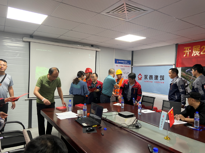 現場,副總經理俞桃蓮、修海金及總經理助理章志強向項目部人員及工人現場分發安全知識手冊、安全知識圖冊等宣傳資料。