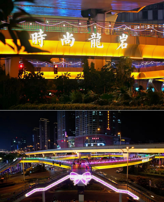 7月26日,由新羅區商務局委托,龍巖市政建設集團有限公司組織實施的龍巖大道萬寶廣場人行天橋夜景文化工程順利完工亮燈,成為龍巖中心城市新的網紅打卡點。該夜景工程是結合“全民樂購·福見龍巖”七夕購物節活動,按“安全環保、節資降耗、實際實效”的原則,以粉紅色為主題,融入時尚龍巖、幸福龍巖元素,設置“福建示范商圈”燈箱、四處蝴蝶結、拱門造型燈和波浪霓虹燈帶等,營造濃厚的“七夕”浪漫時尚氛圍。項目于7月11日開工建設,26日完工投入使用,投資約50萬元。項目對打造“省級示范商圈”,提升龍巖城市形象、增強城市活力,發揮消費促進經濟增長等具有重要意義。